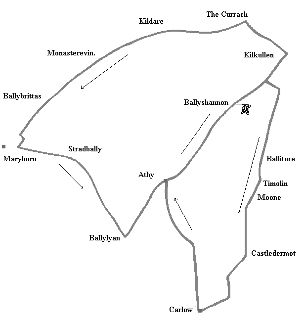 south of Kilcullen where the course turned sharply left, traveling west for 8 miles to Kildare Control, then south-west for 8 miles to Monasterevan Control, next passing Ballybrittas, then two miles before Maryborough,